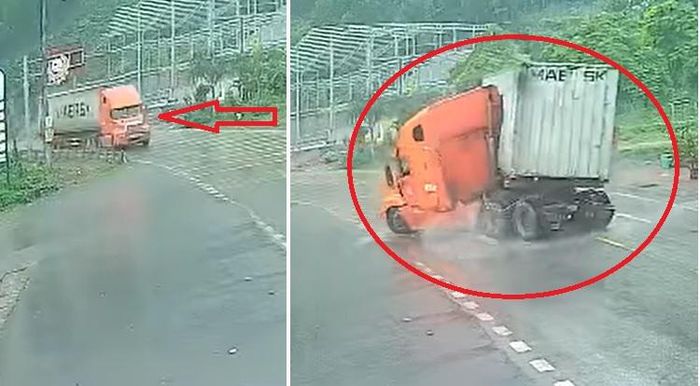 Trời mưa, đường trơn và chạy xe tốc độ cao khi xuống dốc, tài xế xe container đă gặp nạn.
