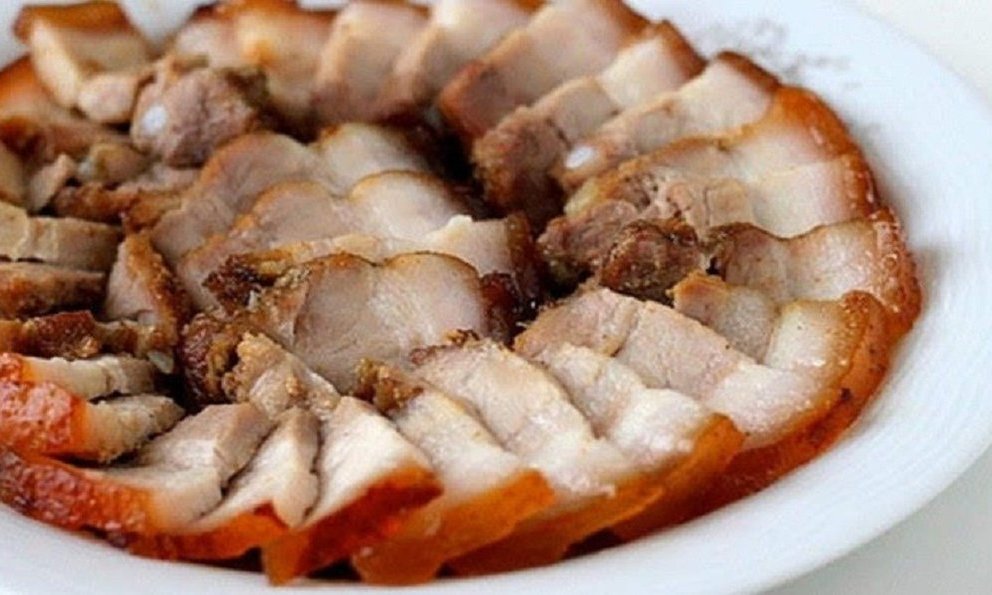 - Cho thịt vào đĩa, lót một miếng giấy thấm hút dầu ở dưới để hút bớt phần mỡ trong miếng thịt. Chờ thịt nguội chút, dùng dao thái mỏng và trình bày lên đĩa. Món này ăn kèm rau sống rất ''hao cơm''.