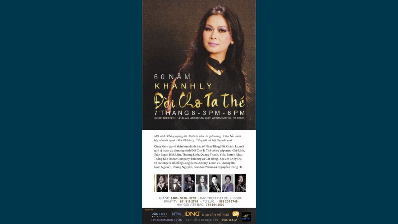 Vào ngày 7 Tháng Tám sắp tới, Chương trình ca nhạc Khánh Ly – Tiếng Hát 60 Năm – Đời Cho Ta Thế – sẽ được tổ chức tại Rose Theater, với tiếng hát của Chế Linh, Tuấn Ngọc, Thương Linh, Bích Liên, Quang Thành, Thắng Đào Dance Company, Ban Hợp Ca Cát Trắng, Ban Nhạc Sỹ Dự. Chương trình sẽ do Lê Đình Y Sa và Jimmy Nhựt điều hợp. Chương trình đang bán các loại vé giá $200; $150; $100 Mỹ kim. Vì số lượng vé có giới hạn, quý vị nhanh tay gọi đến số 714 894 2500 để đặt vé