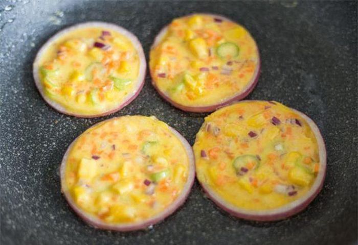 Bước 4: Sau đó, bạn hãy dùng một chiếc muỗng múc hỗn hợp vừa trộn đổ vào các vòng hành tây, đậy nắp chảo đun bằng lửa nhỏ một lúc trong khoảng thời gian chừng 5-7 phút (tùy vào độ nóng của chảo), đợi đến khi bề mặt vòng hành tây đông đặc lại thì tắt bếp đi.