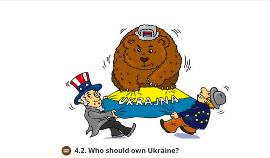 Sau đó, sách giáo khoa tiếp tục minh họa tình hình ở Ukraine bằng một bức tranh châm biếm về lá cờ Ukraine bị xé nát bởi một con gấu mang cờ Nga cùng hai người có biểu tượng của Mỹ và Liên minh châu Âu (EU) trên lưng. Bức ảnh kèm theo câu hỏi "Ukraine thuộc về ai?"