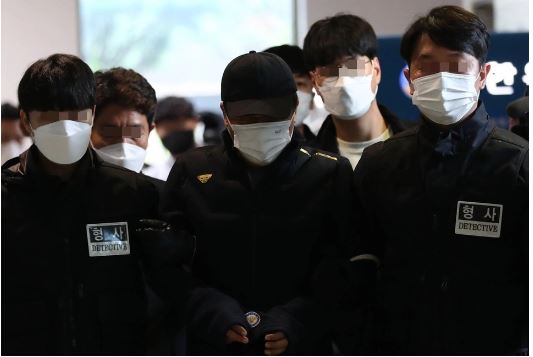 Người đàn ông bị bắt giữ sau khi sát hại vợ trên đường phố. Ảnh: Yonhap.