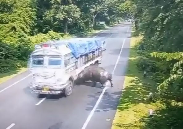 Sự việc hi hữu xảy ra bên trong Vườn quốc gia Kaziranga, Assam, Ấn Độ khiến nhiều người bất ngờ. Chiếc xe tải nhỏ đang trên đường di chuyển theo về hướng Guwahati từ Jorhat khi vụ va chạm xảy ra.