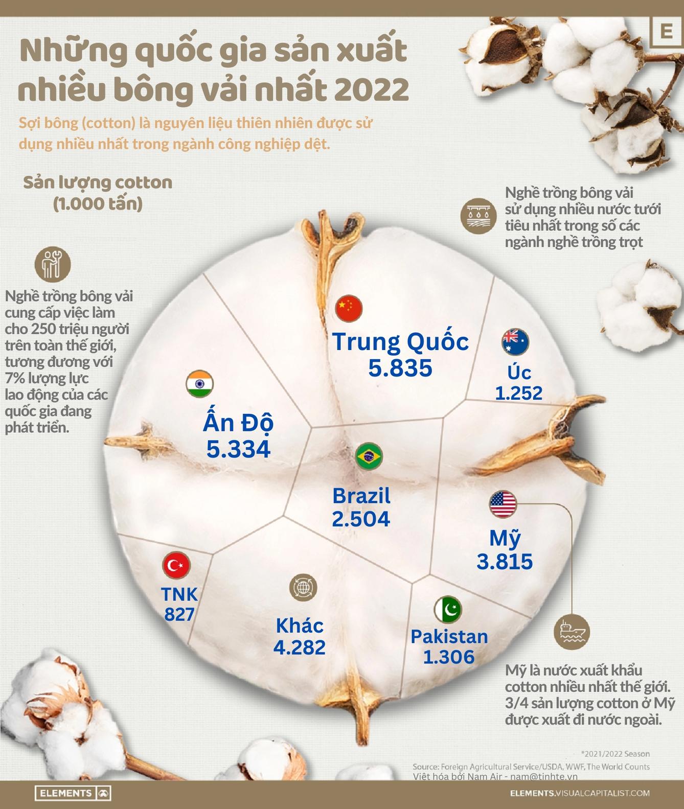 Có tới 74% sản lượng bông vải được sản xuất bởi 5 quốc gia là Trung Quốc, Ấn Độ, Mỹ, Brazil và Pakistan.