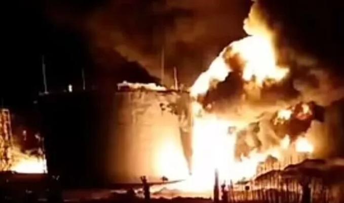 Truyền thông Nga cho hay ngọn lửa bùng lên sau khi một máy bay không người lái thả chất nổ xuống một bồn nhiên liệu, nhưng không rõ máy bay không người lái này do ai vận hành.