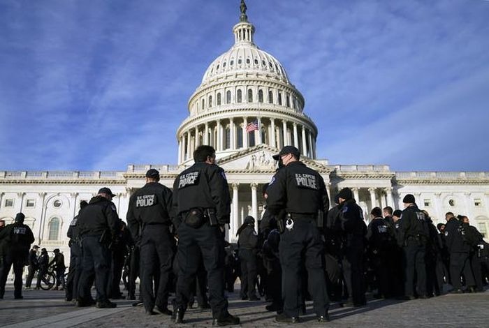 Lực lượng cảnh sát Điện Capitol tập trung trước tòa nhà Quốc hội. Ảnh: AP
