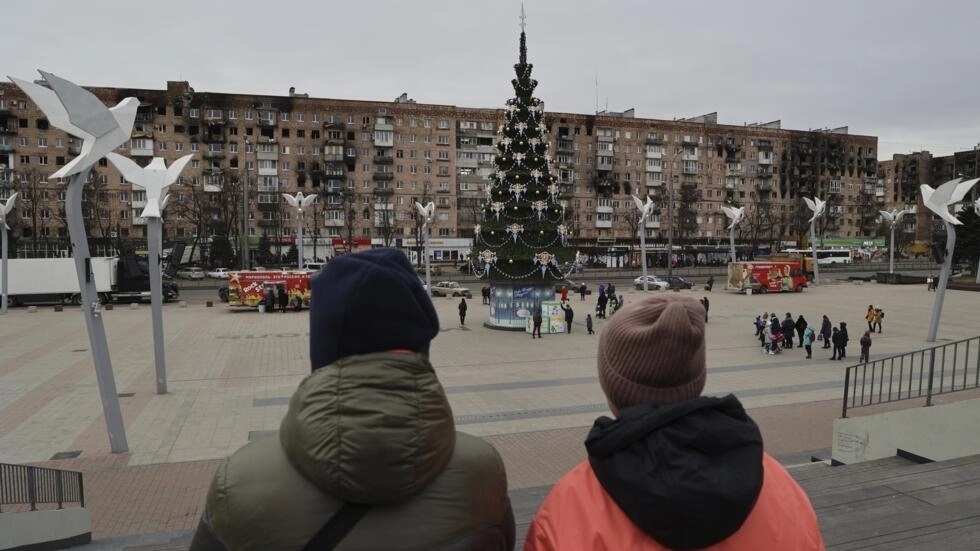 Cây thông được trang trí dịp Giáng Sinh Chính Thống Giáo tại thành phố Mariupol bị Nga chiếm đóng ở vùng Donetsk, Ukraina, ngày 05/01/2023. AP - Alexei Alexandrov