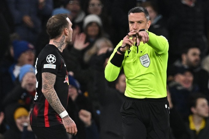 Trọng tài Vincic (phải) chỉ tay vào chấm phạt đền ở giữa hiệp một trận Man City - Leipzig ở sân Etihad hôm 14/3. Ảnh: NP.