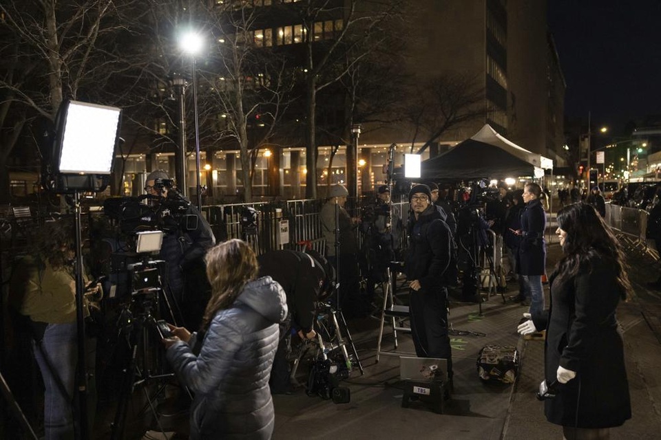 Các phóng viên tác nghiệp bên ngoài tòa án Manhattan, New York ngày 30/3. Ảnh: AP.