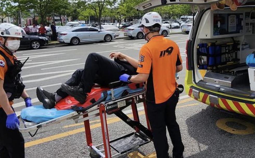 Nhân viên cứu hộ chuyển một hành khách trên cáng lên xe cấp cứu trong vụ mở cửa thoát hiểm máy bay ở Daegu. Ảnh: AP