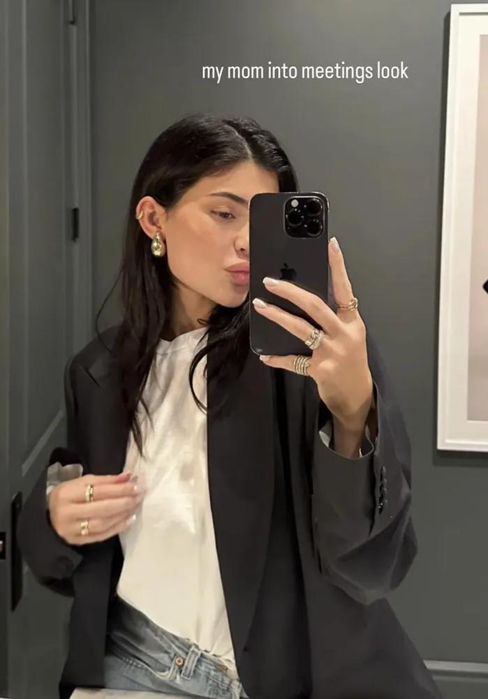 Gần đây, Kylie Jenner đăng tải bức h́nh chụp outfit đi làm lên mạng xă hội. Trong tấm h́nh, cô diện set trang phục đơn giản, bao gồm áo phông trắng, blazer đen và quần jean.