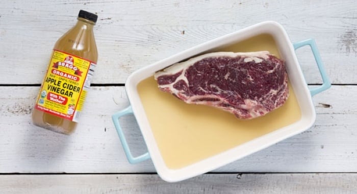 1 muỗng canh muối và một ít giấm trắng vào một thau nước và khuấy đều. Cho thịt cần giã đông vào hỗn hợp. Sau 5-7 phút, thịt sẽ được rã đông mà lại mềm và tươi ngon nữa.