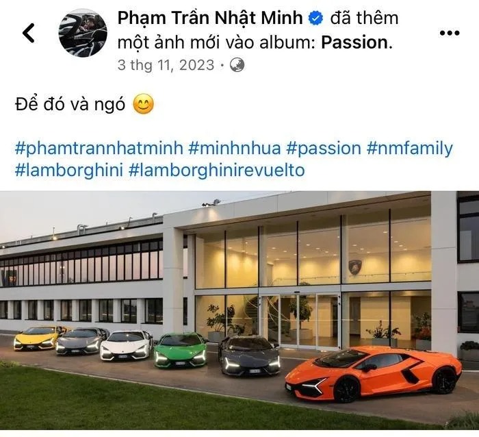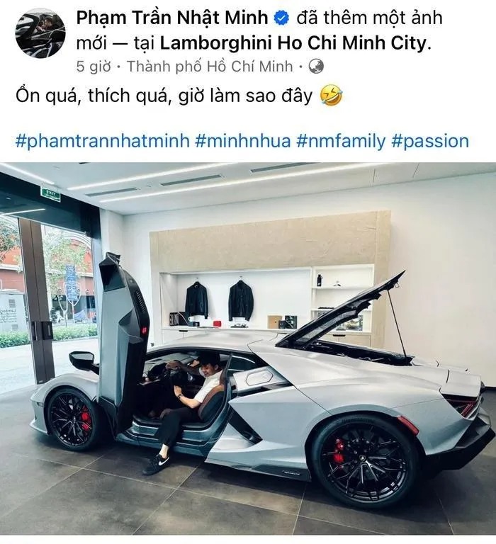 Trưa 23/3, doanh nhân Phạm Trần Nhật Minh (tức Minh Nhựa) đăng tải hình ảnh chụp cùng chiếc Lamborghini Revuelto cùng dòng trạng thái: "Ổn quá, thích quá, giờ làm sao đây". Động thái này khiến cộng đồng mạng không khỏi xôn xao khi Revuelto là mẫu xe vừa được ra mắt tại Việt Nam, dấy lên tin đồn anh sẽ tậu về chiếc xe này.