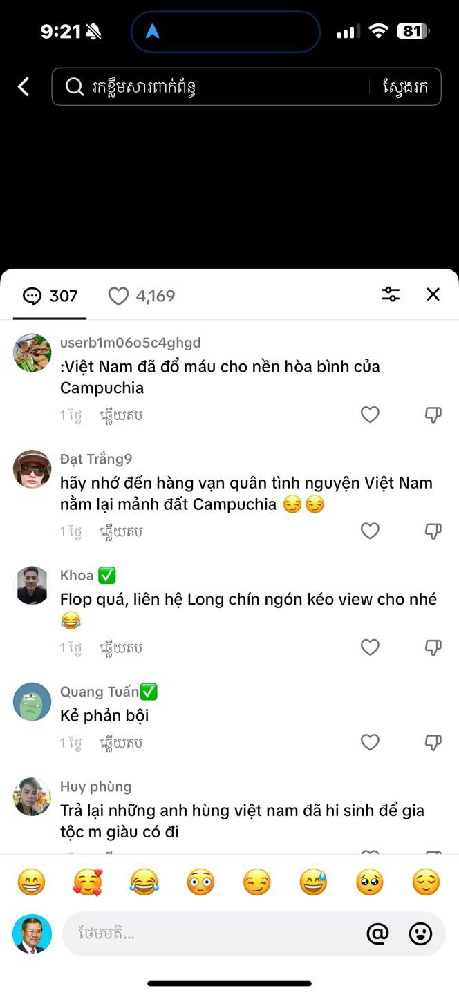 Bộ Thông tin Cambodia cho biết ông Sok Chenda Sophea, Phó Thủ tướng Cambodia, vào hôm thứ Hai, 20 tháng 5, đã triệu tập ông Nguyễn Huy Tăng, Đại sứ cộng sản Việt Nam, để thảo luận về những bình luận xúc phạm từ các bài đăng video TikTok của cựu Thủ tướng Hun Sen. Ông Sok Chenda Sophea hiện cũng giữ chức Ngoại trưởng Cambodia. Ông cho biết những bình luận này “đã gây ra cảm giác xấu trong chính phủ hoàng gia và người dân Cambodia” và yêu cầu nhà cầm quyền cộng sản Việt Nam hợp tác để xác định danh tính những người bình luận. Hành động này diễn ra sau khi ông Hun Sen yêu cầu giới chức hợp tác với cộng sản Việt Nam để truy tìm những người để lại bình luận thiếu tôn trọng bằng tiếng Việt trên các video TikTok của ông. Ông Hun Sen viết trên Facebook vào hôm Chủ nhật, 19 tháng 5, rằng “tôi thực sự ngạc nhiên khi nhìn thấy những bình luận về clip TikTok mà tôi đã đăng”. Trong ảnh chụp màn hình đính kèm bài đăng trên Facebook của ông, các bình luận bằng tiếng Việt viết rằng “Việt Nam đã hy sinh xương máu vì hòa bình ở Cambodia” và “Đừng quên hàng chục nghìn quân tình nguyện Việt Nam đã thiệt mạng ở Cambodia”. Cựu thủ tướng này, hiện là chủ tịch Thượng viện và nắm giữ nhiều quyền lực ở Cambodia, còn bị gọi là “kẻ vô ơn”, “con rối của Trung Cộng” và “kẻ phản bội”. Hun Sen nghi ngờ nguyên nhân của những lời lẽ công kích này có thể là dự án kênh đào Funan Techo được đề nghị và phê duyệt khi ông còn là người đứng đầu chính phủ.