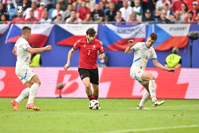 Kvaratskhelia (giữa) đi bóng trong trận Gruzia hòa CH Czech 1-1 ở lượt hai bảng F trên sân Volkspark, Hamburg ngày 22/6. Ảnh: Gruzia Footy