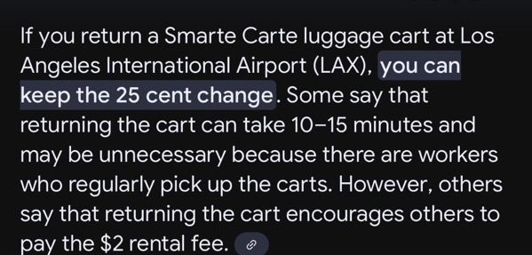 Đa số bỏ tiền coin cho xe đẩy thì không có dụ lấy tiền lại họ lấy tiền đó trả công cho những người đi gôm lại. Đa số từ chỗ đi và tới cách chỗ đậu xe rất xa mà nói tóm lại đa số dân Mít ta mới cần xe đẩy chứ người ngoại quốc ho chỉ có 1 hand luggage và 1 cái lớn thôi nên họ tự kéo vali của họ nhanh và gọn gàng.