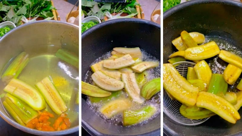 Bắc nồi nước lên bếp, đợi sôi thì cho 3 trái chuối vào luộc cùng với nghệ trong khoảng 30 phút. Tận dụng lại chảo dầu lúc nãy chiên đậu hũ, bạn cho chuối vào chiên đến khi vàng đều.