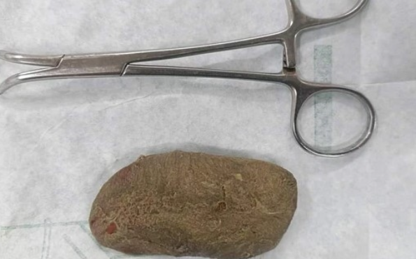Các bác sĩ nhanh chóng cho bệnh nhân chụp CT Scan và phát hiện một dị vật lớn đã đã trôi qua thực quản, xuống tới gần 1/2 ruột non, gây nghẹt ruột và các triệu chứng nguy hiểm đi kèm.