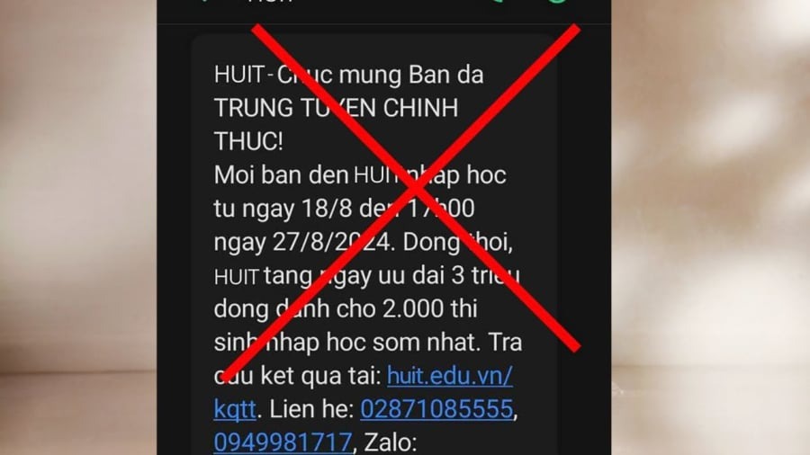 Nội dung tin nhắn mà đối tượng lừa đảo gửi cho nạn nhân có mẫu như sau: "HUIT - Chúc mừng bạn đã trúng tuyển chính thức! Mời bạn đến HUIT nhập học từ ngày 18-8 đến 17h ngày 27-8-2024. Đồng thời, HUIT tặng ngay ưu đãi 3 triệu đồng dành cho 2.000 thí sinh nhập học sớm nhất. Tra cứu kết quả tại: huit.edu.vn/kqtt. Liên hệ:028710…".