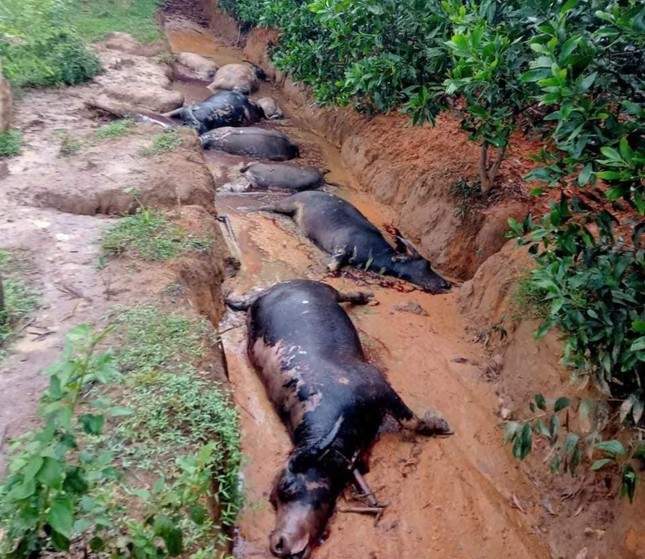 Theo lãnh đạo địa phương, nhiều khả năng trong những ngày mưa bão, đàn trâu 8 con chăn thả trong khu vực trang trại bị sét đánh chết. Vì số trâu này nghi chết trước đó vài ngày, gia chủ không thể xẻ thịt bán. Ước tính gia đình ông Thuý thiệt hại trên 100 triệu đồng.