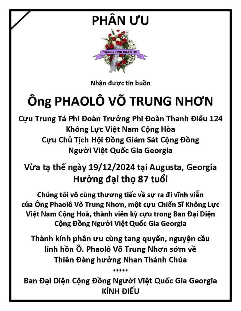 Thành kính phân ưu cùng tang quyến, nguyện cầu linh hồn Ông Phaolô Võ Trung Nhơn sớm về Thiên Đàng hưởng Nhan Thánh Chúa.