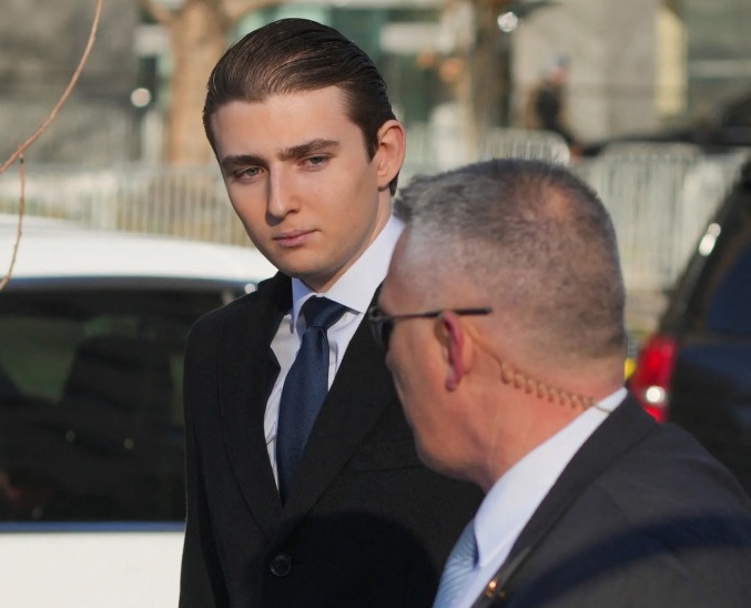 Sáng 20/1 (theo giờ địa phương), nam sinh Đai học New York giữ vẻ mặt điềm tĩnh khi bước vào nhà thờ St. John's Episcopal đối diện Nhà Trắng. Anh mặc áo choàng đen dài, sơ mi trắng và đeo cà vạt xanh tím. Ngoài chiều cao vượt trội, 2,05 m, Barron còn gây chú ý với mái tóc được chải chuốt kiểu mới, thay vì để bồng bềnh lãng tử như mọi khi.