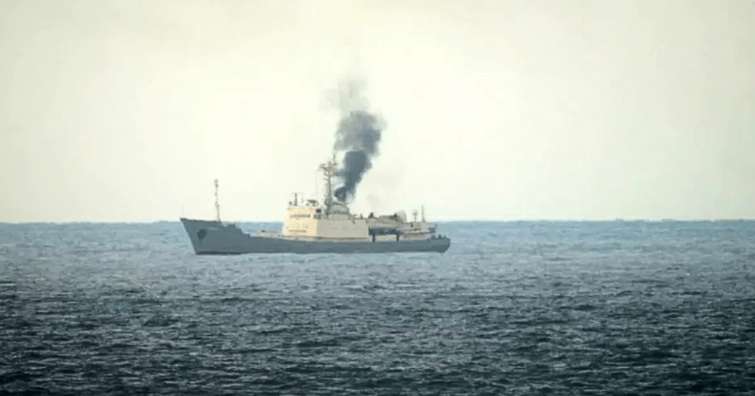 Hình ảnh tàu trinh sát điện tử Kildin của Hải quân Nga bốc cháy ngoài khơi Syria (Ảnh: The Guardian).