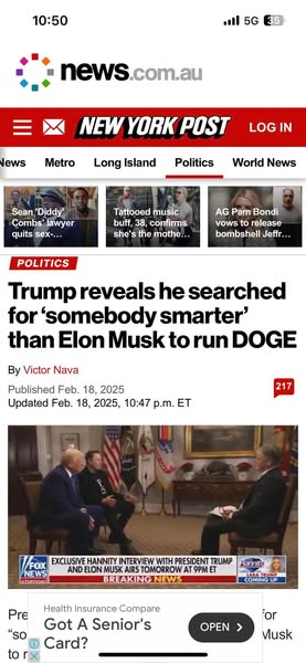 "Bạn biết đấy, tôi muốn t́m một người thông minh hơn anh ấy", Trump nói với Hannity khi Musk ngồi cạnh vị tổng thống thứ 47.