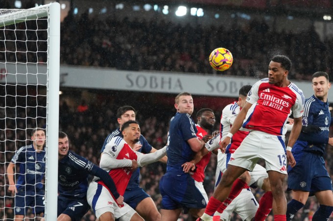 Hậu vệ Jurrien Timber (số 12) đánh đầu ghi bàn mở tỷ số từ pha đá phạt góc trong trận thắng Man Utd 2-0 ở vòng 14 Ngoại hạng Anh trên sân Emirates, London ngày 4/12/2024. Ảnh: AP