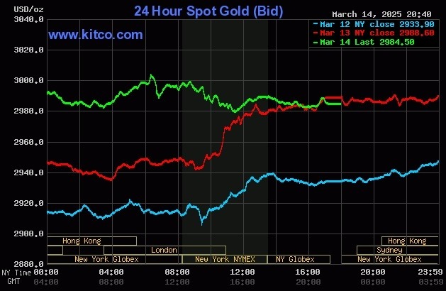 Chốt phiên giao dịch 14/3, giá vàng thế giới giao ngay giảm 4 USD về 2.984 USD một ounce. Trước đó, giá có thời điểm lập đỉnh mới tại 3.004 USD do nhu cầu trú ẩn tăng cao vì thuế nhập khẩu của Mỹ.