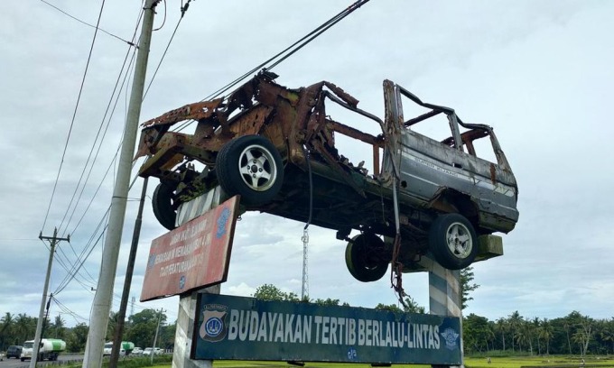 Chiếc Toyota Zace chỉ còn một phần khung vỏ nằm trên cao nhằm cảnh báo an toàn giao thông ở Yogyakarta, Indonesia. Ảnh: detikcom