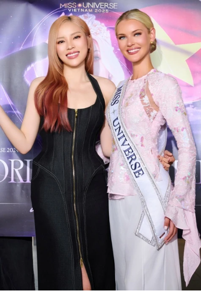 Hoa hậu Kỳ Duyên chào đón Miss Universe 2024 Victoria Kjær Theilvig. Ảnh: BTC.