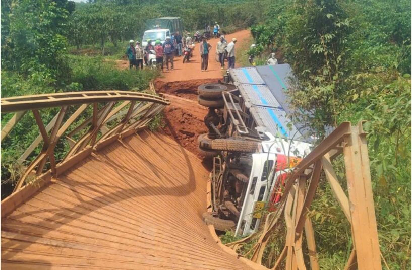 Khi qua khỏi mố cầu treo bắc qua suối Đạ R’Klach, công trình bất ngờ đổ sập khiến xe tải rơi xuống suối, lật nghiêng về bên trái chiều di chuyển. Tài xế Duy kịp thoát ra ngoài, không bị thương.