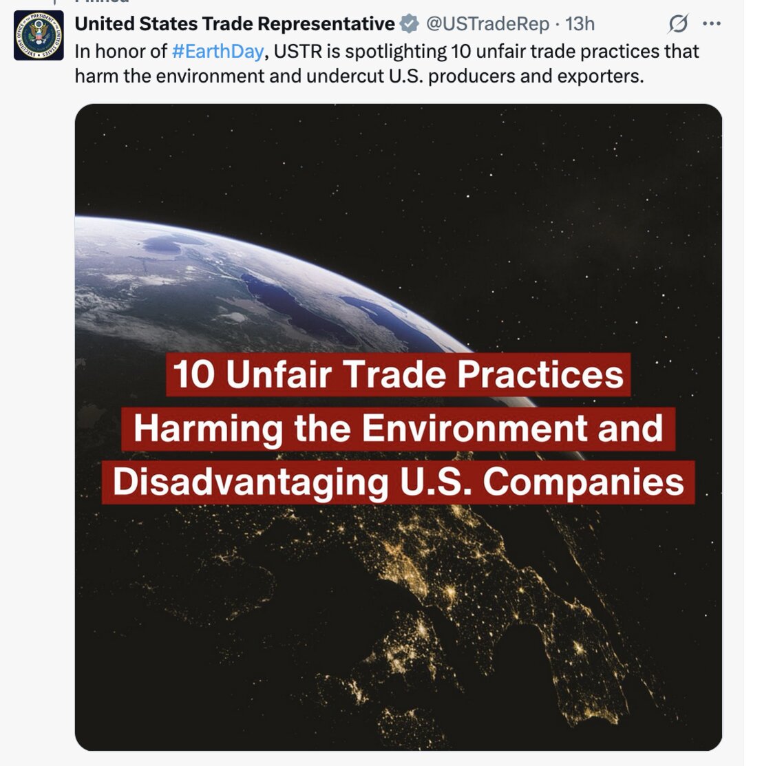 Theo đài RTI của Đài Loan hôm 23/4, ngày 22/4 hằng năm là Ngày Trái Đất. Trên nền tảng mạng xã hội X, Văn phòng Đại diện Thương mại Mỹ đã đăng tải thông điệp kỷ niệm ngày này bằng cách nêu bật 10 hành vi thương mại không công bằng đang gây hại đến môi trường và làm suy yếu vị thế của các nhà sản xuất và xuất khẩu Mỹ.