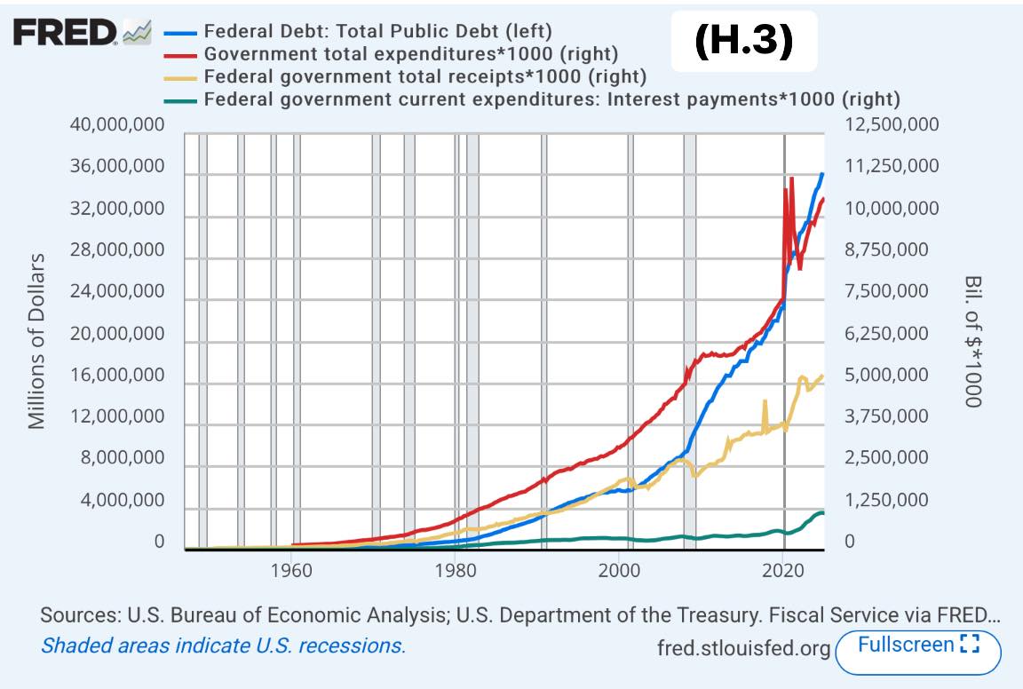 c. Hiệu ứng của a. và b. là nợ chính phủ tăng cao chót vót (H.1, H.3). Nợ công Mỹ cuối 2023 là $34,4 ngàn tỷ, GDP $27 ngàn tỷ [2]. (Hiện đă $36,8 ngàn tỷ. Nhưng cơ cấu chắc không có ǵ thay đổi nên vẫn mang con số $34,4 ngàn tỷ ra phân tích).