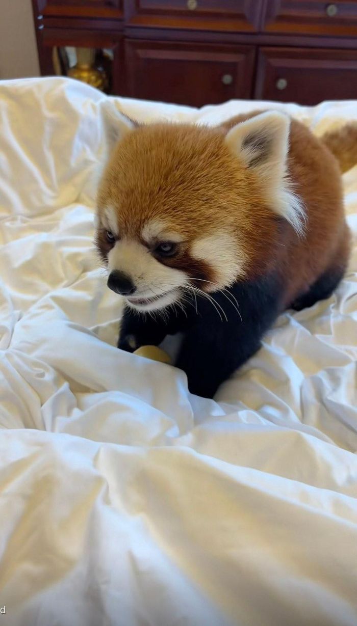 Khách sạn sử dụng bốn “nhân viên gấu trúc đỏ”, trong đó có một cá thể trưởng thành khoảng hai tuổi thường xuyên thực hiện nhiệm vụ đánh thức khách. Ảnh: Douyin