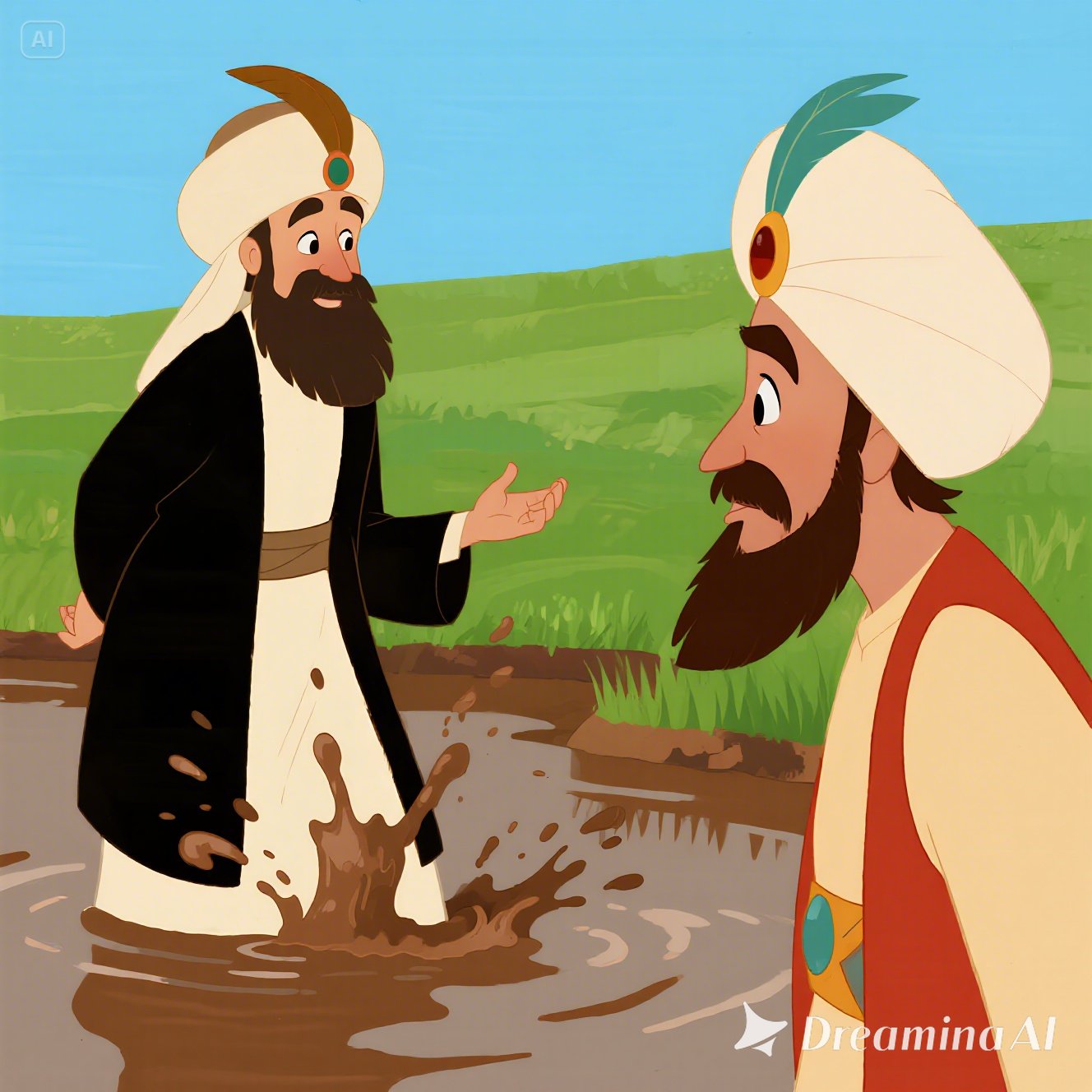 Có lần thầy Nasredin đi qua bùn lầy, dép bị lún sâu không kéo ra được. Một người đi ngang hỏi: