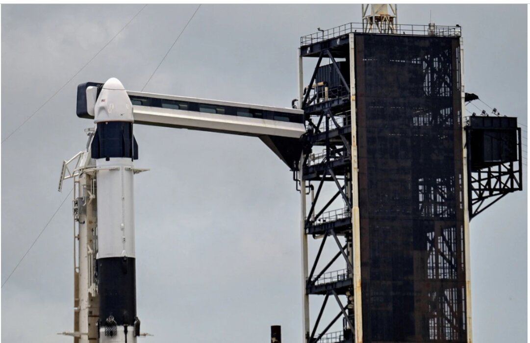 Một tàu vũ trụ Dragon chở phi hành đoàn nằm trên đỉnh tên lửa Falcon 9 của SpaceX tại Tổ hợp Phóng 39-A vào ngày 11/6. Đây phương tiện duy nhất hiện nay có thể chở phi hành gia tới và về từ Trạm Vũ trụ Quốc tế. Ảnh: Reuters.