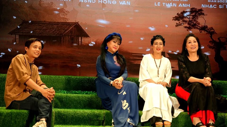 NSND Hồng Vân (Áo đen) cùng các nghệ sĩ trong một vở diễn. Ảnh: FBNV