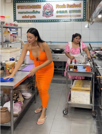 Napak-on “Prece” Jiraratchataphak, chủ quán ăn có tên Kai Yok Krok, thu hút sự chú ý của cư dân mạng nhờ các video nấu ăn trong trang phục táo bạo. Cả khách Thái Lan và người nước ngoài đổ xô đến quán không chỉ để thưởng thức đồ ăn mà còn để chụp ảnh selfie cùng bà chủ, theo Thaiger.