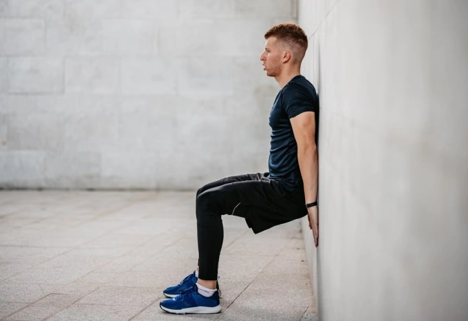 Một người đàn ông đang tập động tác squat dựa tường. Ảnh: Urbazon