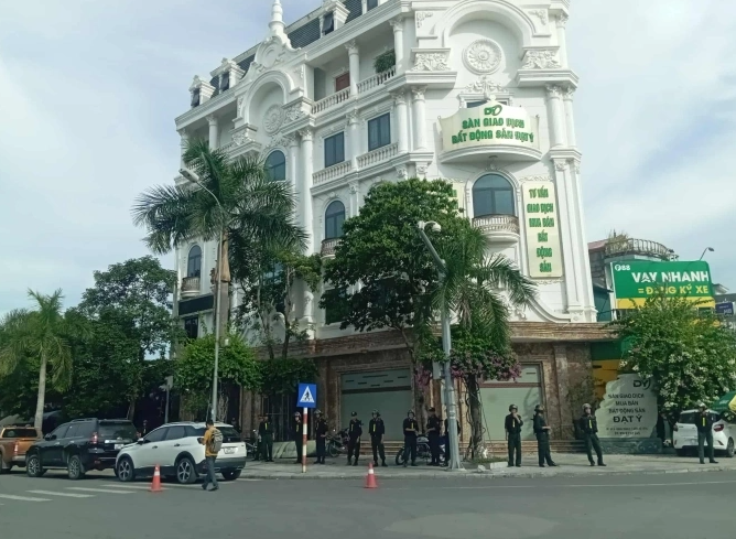 Căn nhà 5 tầng, sơn màu trắng, vị trí hai mặt tiền trên đường Quang Trung giao với đại lộ Võ Nguyên Giáp bị phong tỏa trong 3-4 giờ. Đây là nơi đặt trụ sở sàn giao dịch bất động sản "Đạt Ý".