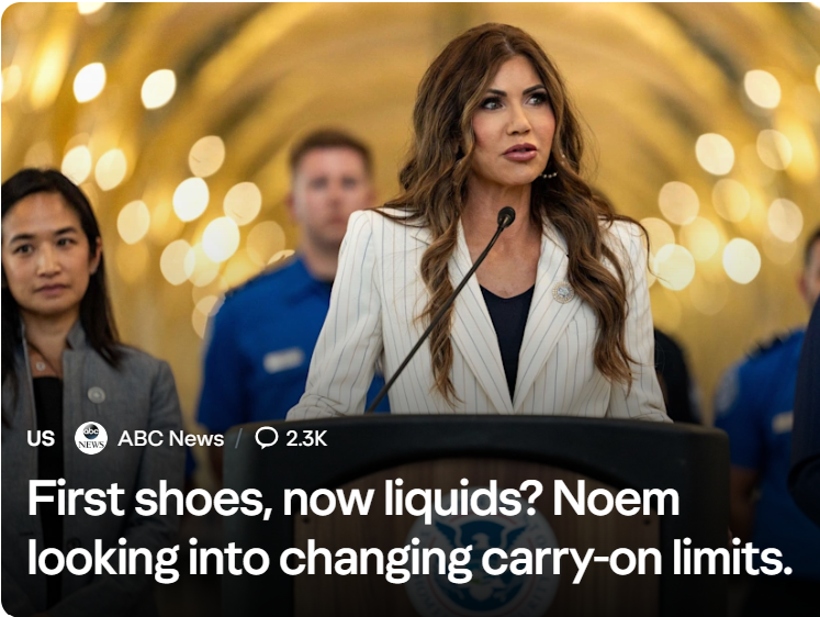 Ngày 8 tháng 7, Bộ trưởng Noem thông báo rằng DHS sẽ chấm dứt quy định hành khách phải cởi giày để kiểm tra trước khi lên máy bay thương mại, vốn đã kéo dài gần 20 năm. Chính sách này được áp dụng vào năm 2006 sau khi Richard Reid, kẻ được gọi là "kẻ đánh bom giày", bất thành khi cố gắng kích nổ chất nổ dẻo giấu trong giày trên chuyến bay từ Paris, Pháp đến Miami, Florida vào ngày 22 tháng 12 năm 2001.