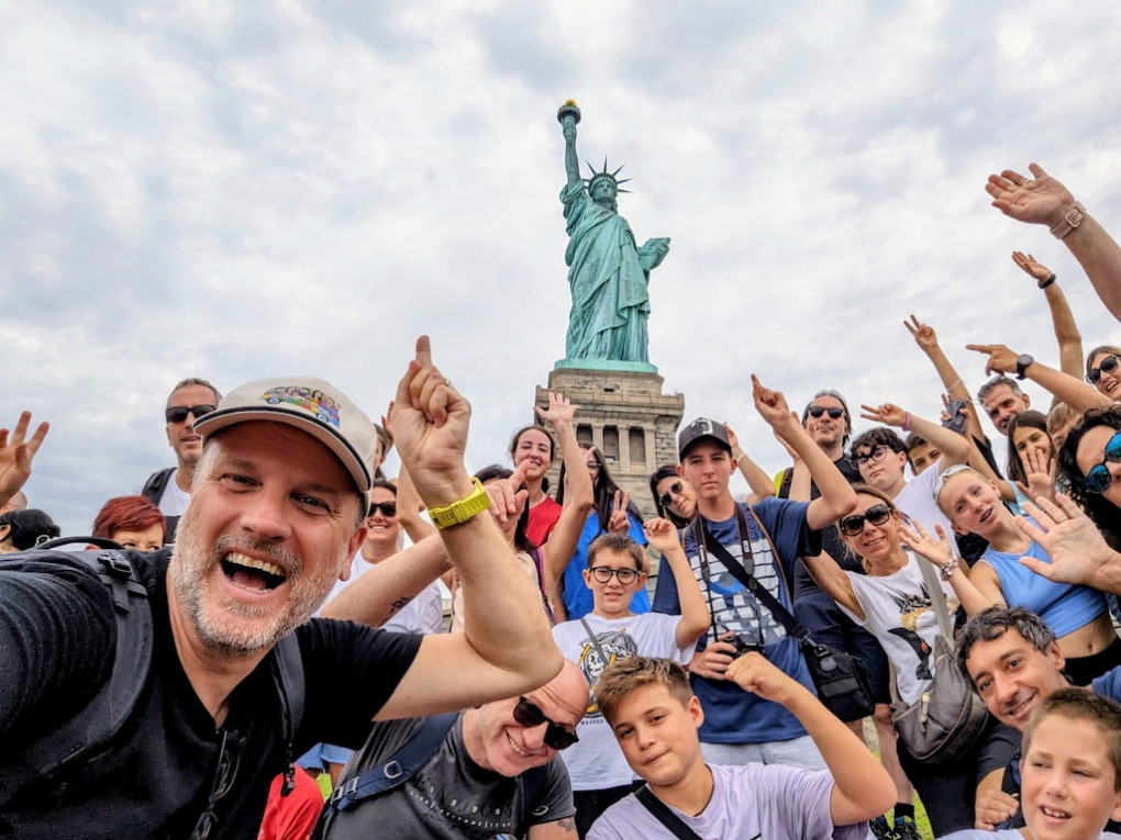 Du khách chụp ảnh tượng Nữ thần Tự do ở New York. Ảnh: Bambini