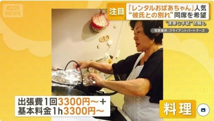 Một công ty gây chú ý khi cung cấp dịch vụ cho thuê “bà ngoại” với giá mỗi giờ khoảng 3.300 Yen (khoảng 580.000 đồng), cộng thêm một khoản phí đi lại.