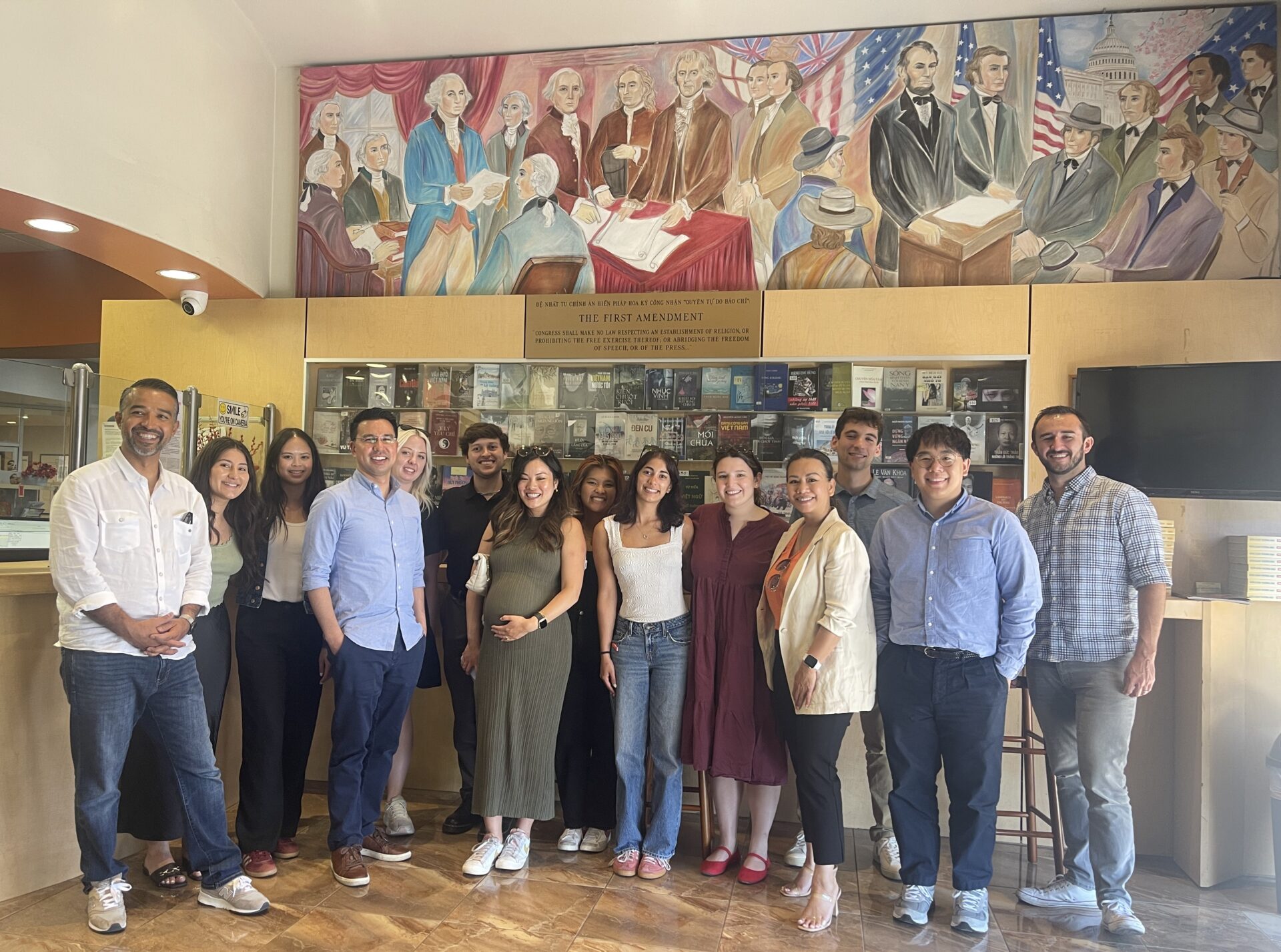 14 nhân viên Văn Phòng Dân Biểu Derek Trần ghé thăm nhật báo Người Việt, Westminster, qua sự hướng dẫn của cô Roxanne Chow, cố vấn cao cấp của vị dân biểu.