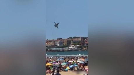 Tiêm kích EF-18A Tây Ban Nha suýt lao xuống bãi biển khi biểu diễn ở thành phố Gijon, dường như vì phải tránh đàn chim đang bay.
