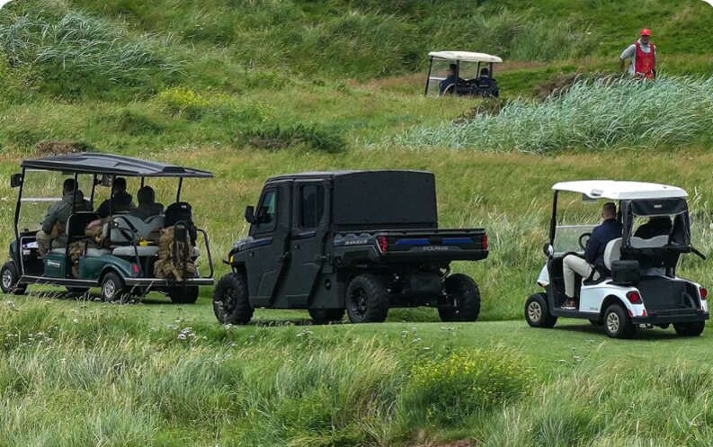 Chiếc xe được thiết kế đặc biệt để bảo vệ đạn đạo, mang tên "Golf Force One", dường như đã ra mắt công chúng trong một vòng golf giữa Tổng thống Donald Trump và con trai ông, Eric, tại sân golf Trump ở Turnberry, Scotland, vào cuối tuần qua.