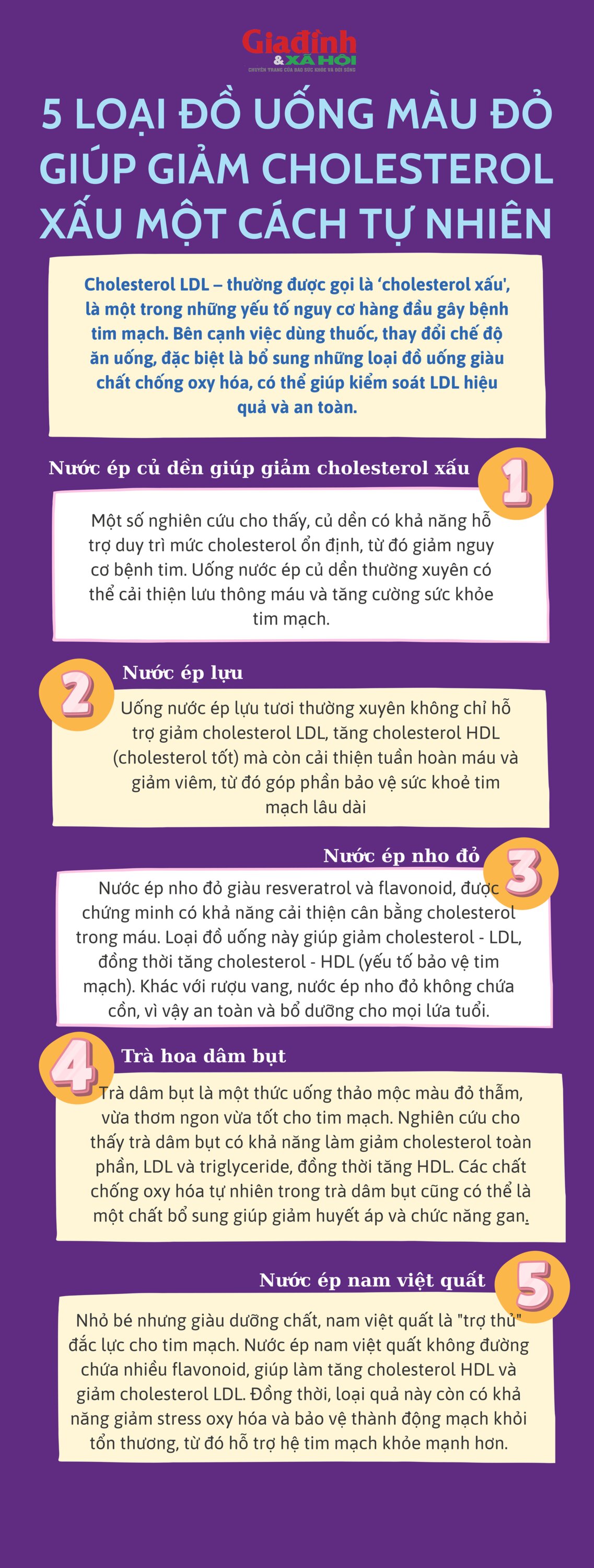 Infographic: 5 loại đồ uống màu đỏ giúp giảm cholesterol xấu và bảo vệ tim mạch tự nhiên