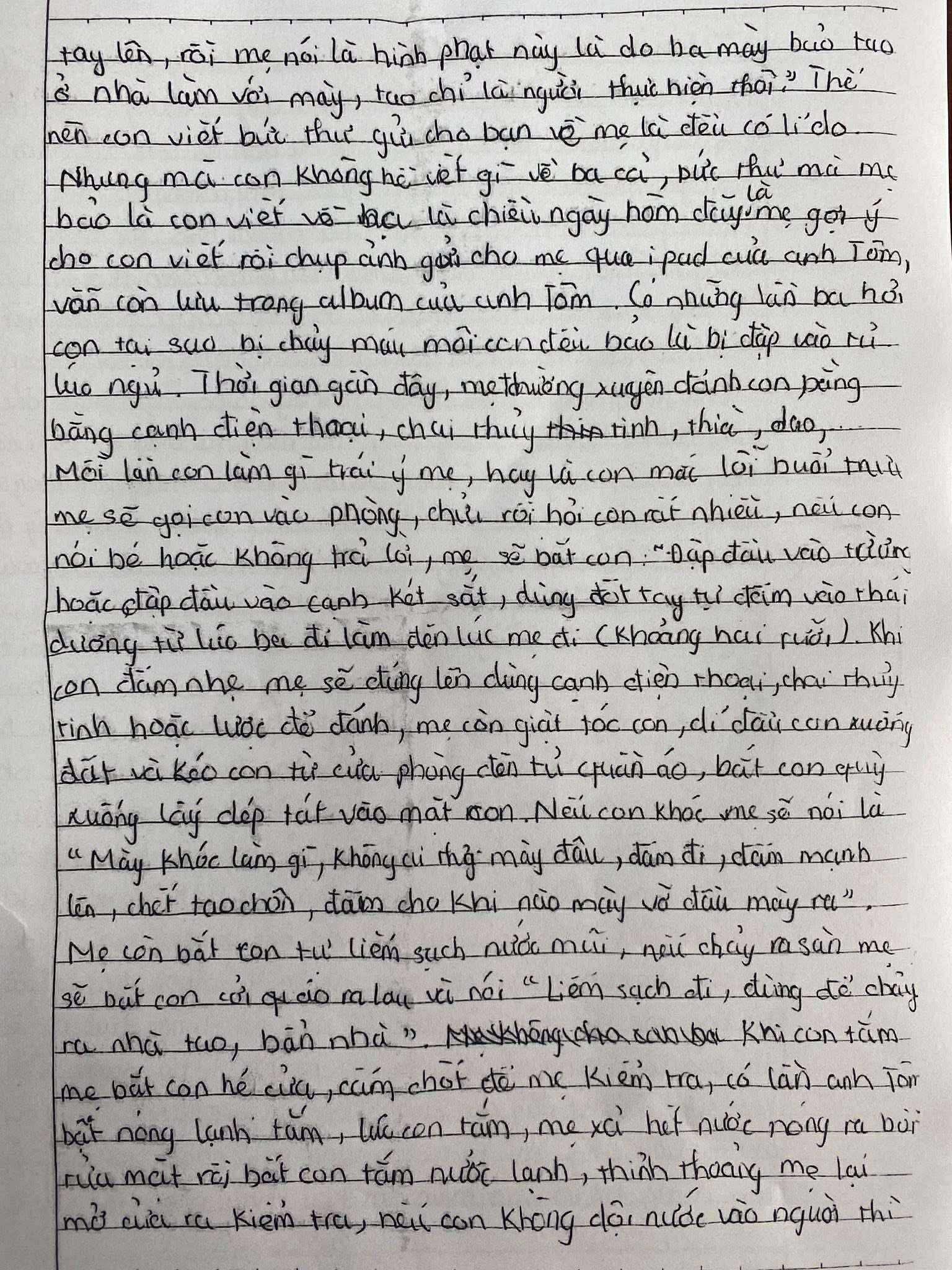 Theo đó, trong bức thư được cho là của bé trai, có đoạn viết: “Thời gian gần đây, mẹ thường xuyên đánh con bằng điện thoại, chai thủy tinh, thìa, dao…”. Đi kèm, một đoạn video từ camera an ninh ghi lại cảnh một người phụ nữ dùng điện thoại đánh vào đầu bé, bắt em đứng cúi mặt xuống bàn, không được ngồi ghế.